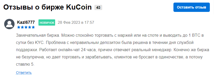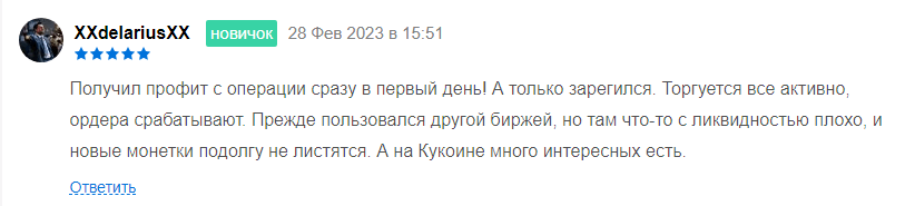 Указан и широкий набор «монеток». Kucoin по праву называют лучшей биржей альткоинов, в отличие от всех конкурентов здесь можно найти монеты, не размещенные ни на одной другой площадке. Это позволяет на ранних этапах вложиться в перспективный актив, прилично заработав в будущем. Еще одна причина перехода автора свежего отзыва на Kucoin – проблема с ликвидностью на использовавшейся ранее бирже. Это один из главных факторов заработка — возможность вовремя войти в рынок и ликвидировать позицию позволяет биржевикам прибыльно закрывать сделки в любое время.