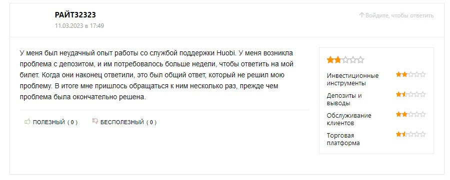 Другой пользователь на одном из сайтов-обзорщиков в англоязычном пространстве написал развернутый комментарий о поддержке. После появления проблемы с депозитом компания отвечала клиенту более недели. Проблема решена, но пользователь дал оценку бирже в 2 звезды из 5.