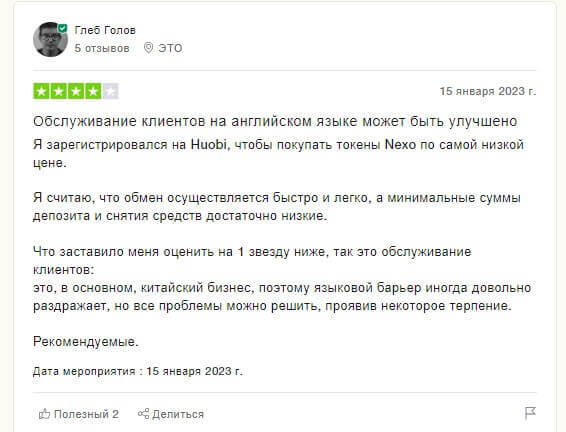 В другом отзыве клиент пишет, что пришел на биржу для покупки токенов Nexo, говоря о том, что обмены проходят быстро, а сумма снятия депозита и вывода средств для него низкие. Из проблем, обнаруженных клиентом стал “языковой барьер”, так как сотрудники отвечают на ломаном английском. В целом, понятное дело, что бизнес китайский, но компании бы стоило подумать о том, чтобы предоставлять международную поддержку, отвечающая пользователям на других языках.