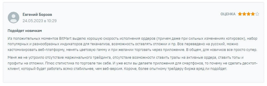 В целом, отзывы пользователей о криптобирже BitMart складываются двояко. С одной стороны, трейдеры ценят платформу за широкий ассортимент предлагаемых криптовалют и токенов, удобство интерфейса и наличие мобильного приложения. Также положительно отмечается быстродействие техподдержки и многоязычность сервиса, что делает его доступным для широкого круга пользователей по всему миру.