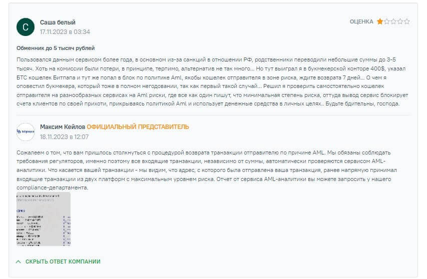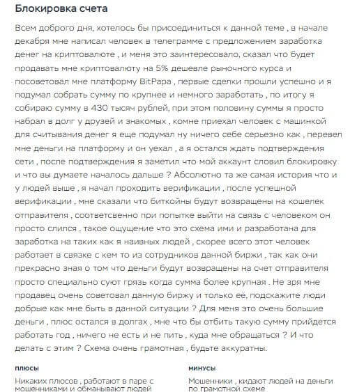 Ещё один отзыв, связанный с негативной стороной сервиса – блокировка счета. Клиент заявляет о том, что компания заблокировала его счет, после проведения платежа на его счет в сервисе BitPapa. А компания заявила, что средства будут возвращены на счет отправителя и обвиняет в сговоре с человеком, предложившему заработать на криптовалюте. По итогу человек остался в долгах, а деньги свои обратно он так и не получил.