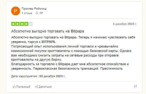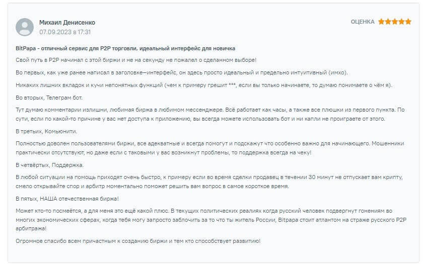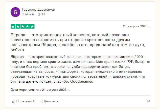 Другой пользователь оценил криптокошелек от проекта BitPapa, позволяющего сэкономить в процессе отправки крипты другим клиентам сервиса. Также выделил удобство при пользовании P2P, техническую службу поддержки, бота в Телеграмме, позволяющий обменивать средства в интерфейсе удобного мессенджера.