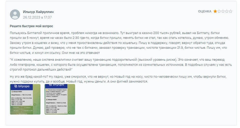 Прочитав отзывы Битпапа от пользователей, можно увидеть как негативные комментарии, так и положительные. В одном из них клиент пишет о том, что после выигрыша в онлайн-казино вывел средства на счет и утром обнаружил, что его биткоины пропали со счета. После связи с технической поддержкой они рассказали о том, что платеж поступил из подозрительного кошелька, хотя клиент написал о том, что “битки были чистые”. В ответ получил информацию, что крипта будет передана на тот же счет, откуда поступили.