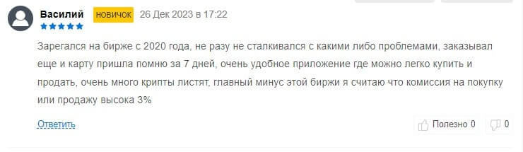 Другой клиент написал то, что работает с биржей с 2020 года и за это время не было никаких проблем, в том числе пользовался их картой, которая пришла буквально за неделю. Поэтому такая площадка является одной из неплохих для новичков, обладающая многофункциональностью.