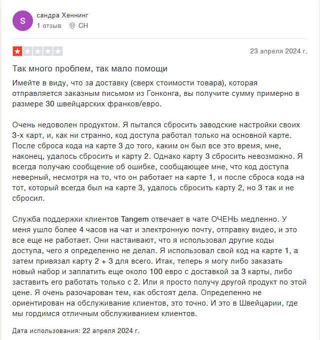 Существует также замечания связанные с безопасностью: хотя Tangem Wallet использует передовые технологии для защиты данных, некоторые эксперты утверждают, что подобные системы всё еще уязвимы для определённых видов атак, что потенциально может подвергнуть риску средства пользователей. Также стоит отметить, что жалобы поступают и на службу поддержки, которая зачастую не способна оперативно решать возникающие у пользователей проблемы, что усугубляет общее впечатление от использования продукта.