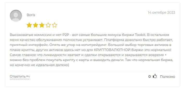 Один из клиентов дал нейтральный окрас своему отзыву, сказав, что на бирже высокие комиссии, а также отсутствует P2P-торговля. При этом из плюсов отметил скорость работы платформы и приятный интерфейс. Также рассказал о большом ассортименте криптовалютных пар, по которым можно вести торговые операции. Также отметил и отсутствие проблем с покупкой или выводом средств.