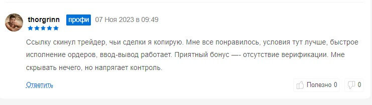 Один из пользователей написал, что перешел на биржу из-за трейдера у которого копирует сделки. Было отмечено удобство исполнения ордеров, а также то, что процесс ввода и вывода средства работает как надо. Также в качестве приятного бонуса рассказал об отсутствии необходимости в прохождении верификации, которая у многих клиентов может вызывать трудности.