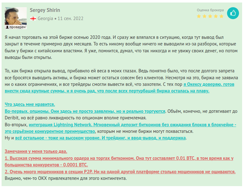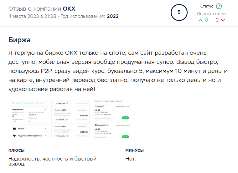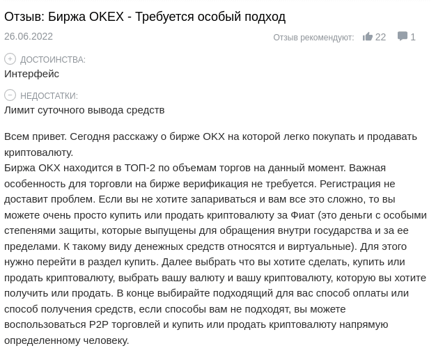 Следующий отзыв о выводе средств включает в себя полный обзор наиболее востребованного функционала. Трейдер рассказывает о больших объемах проводимых здесь операций, за счет чего площадкой уверенно удерживаются места в ТОП-10. Отличительная особенность OKX — возможность торговли без верификации. Однако в таком случае клиенты имеют ограничения на вывод денег, и это является единственным нюансом для варианта без прохождения процедуры KYC.