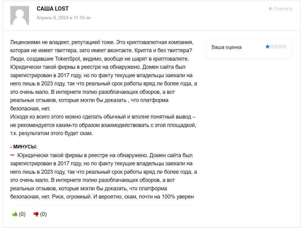 Негативные мнение пользователей: свежие отзывы Tokenspot от реальных трейдеров
