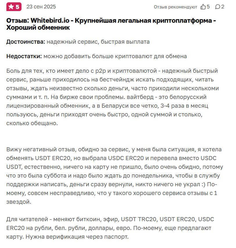 В сумме позитивные отзывы про Whitebird обычно сводятся к простому тезису: сервис удобен, работает быстро, а типовые операции (обмен и вывод) проходят без “приключений”, если соблюдать инструкции. Именно сочетание понятного интерфейса, нормальной скорости и предсказуемых действий чаще всего формирует лояльность и желание пользоваться платформой дальше.