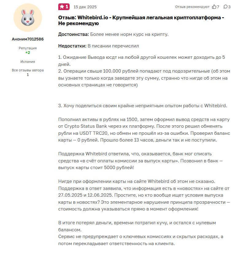 Негативные отзывы Whitebird чаще всего связаны не с самим интерфейсом или “сложностью”, а с ситуациями, когда вывод средств идет не по привычному сценарию. Пользователи описывают случаи, когда операция по снятию активов задерживается, статус долго не меняется, или требуется дополнительная проверка. В таких моментах возникает главный эмоциональный триггер: деньги “в пути”, а сроки непонятны. Даже если причина объективная (проверки безопасности, требования комплаенса, ограничения банка, нагрузка на сеть), человек воспринимает это как проблему сервиса, потому что ожидает быстрый и предсказуемый результат.