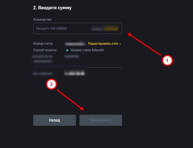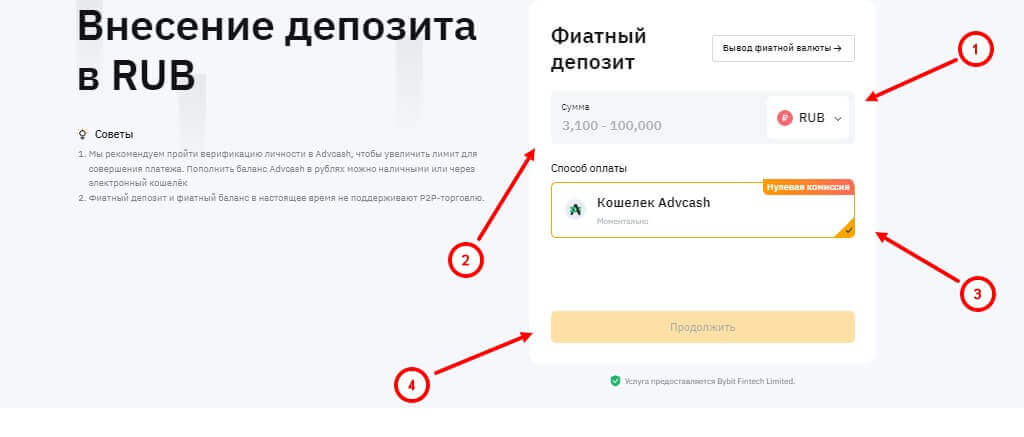 Затем выбрать валюту “RUB”, указать сумму в рублях, выбрать AdvCash (если выборов несколько) и нажать на кнопку “Продолжить”.