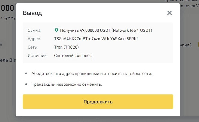 Затем нажмите на кнопку “Вывод” и подтвердите перевод кликнув мышкой по желтой кнопке “Продолжить”.