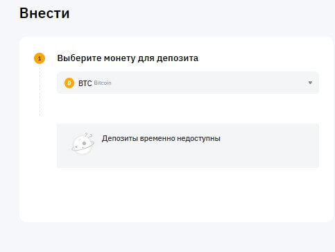 При отказе выполнить требование ниже названия криптовалюты высвечивается строка “Депозиты временно недоступны”.
