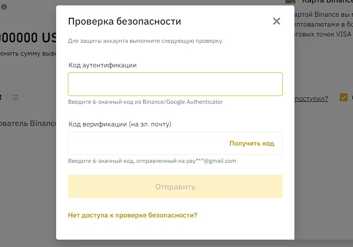 Если подключен Google Authenticator, то в таком случае введите его из мобильного приложения, а также код верификации, который придется на электронную почту или мобильный телефон.