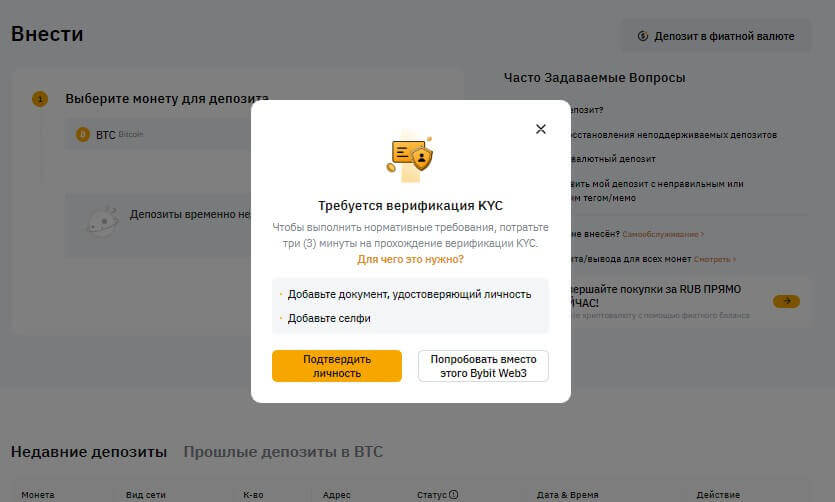 Актуальные сведения о комиссии на бирже Binance на сегодня сможет каждый на сайте биржи. Что касается биржи ByBit, то для пополнения определенных активов необходимо пройти верификацию. Например, при пополнении Биткоина биржа требует пройти верификацию – это говорится в специальном окне после выбора криптовалюты. Подробно о верификации читайте здесь.