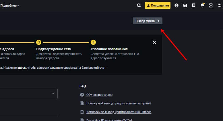 Затем в открывшейся странице пользователю нужно кликнуть на “Вывод фиата”.