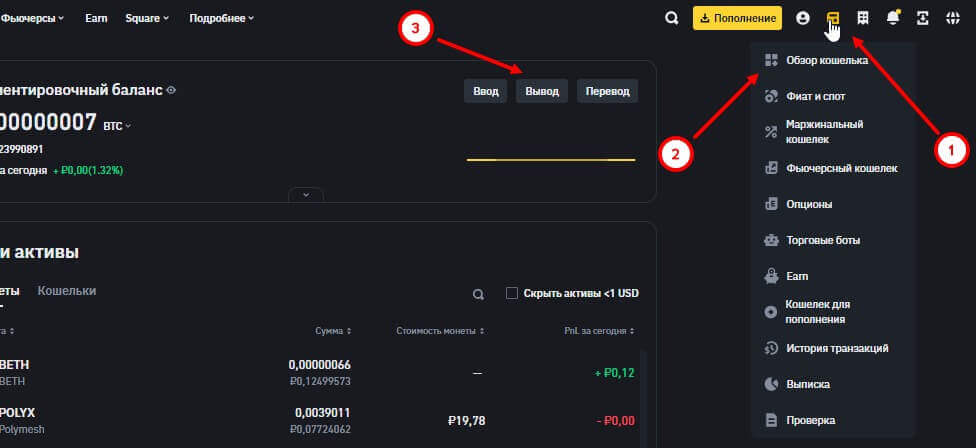 Затем перейдите на страницу, связанную с непосредственным выводом средств на криптовалютной бирже Binance. Необходимо открыть раздел “Кошелек” – “Фиат и спот”.
