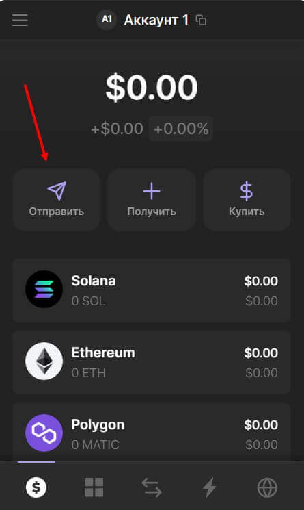 Чтобы выполнить перевод криптовалюты, нужно открыть расширение для браузера и нажать на кнопку “Отправить”.