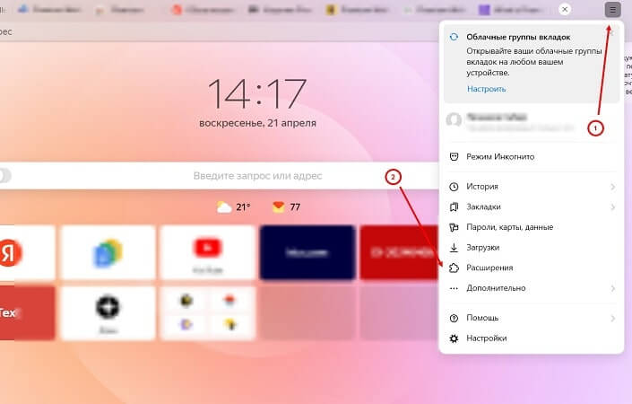 - В браузере Yandex, который используется в качестве примера, нажмите на три полоски и откройте раздел «Расширения»;