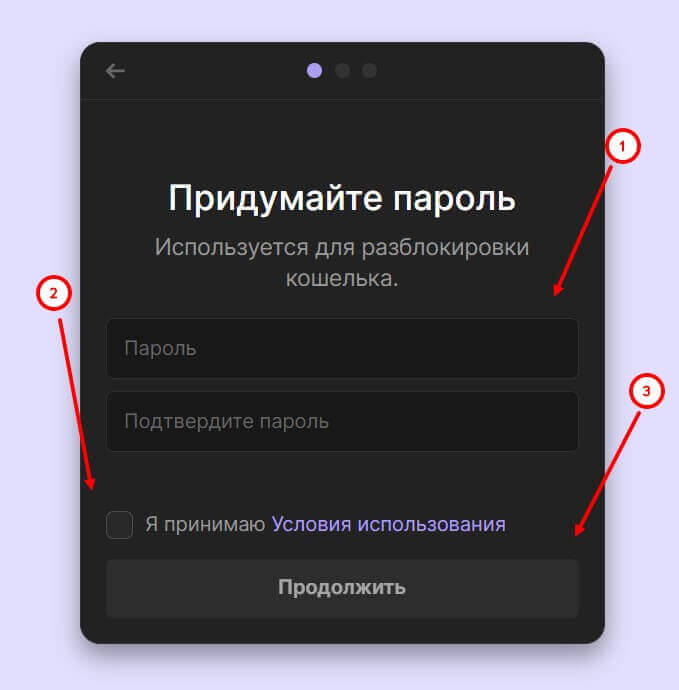 После того как нажали на кнопку “Создать новый кошелек”, появится форма, где нужно указать наиболее сложный пароль и принять необходимые условия использования, а также кликнуть на кнопку “Продолжить”. Прочитать положения можно нажав на гиперссылку “Условия использования”.