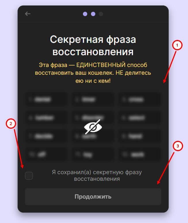 Затем нужно сохранить секретную фразу восстановления (seed-фраза). Запишите на листочек и храните в надежном месте или же создайте текстовый файл и храните на флешке. Это позволит повысить безопасность при использовании кошелька. После того как записали, проставьте галочку в пункте “Я сохранил(а) секретную фразу восстановления” и нажмите на кнопку “Продолжить”.