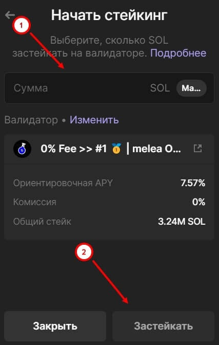 После выбора указываете сумму в монетах SOL и затем кликните на кнопку “Застейкать”. Срок стейкинга зависит от валидатора (от 7 до 14 дней). Комиссия за стейк монет равен 0%.