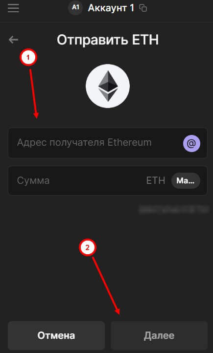 Укажите адрес кошелька получателя и необходимую сумму монет, которую планируете перевести. Затем нажмите на кнопку “Далее”.
