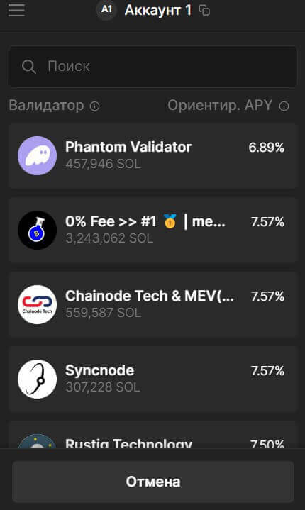 Затем выберите валидатора. Каждый из них предлагает разные ARP (% годовых). На апрель 2024 года показатель равен от 6,89 до 7,57% годовых.