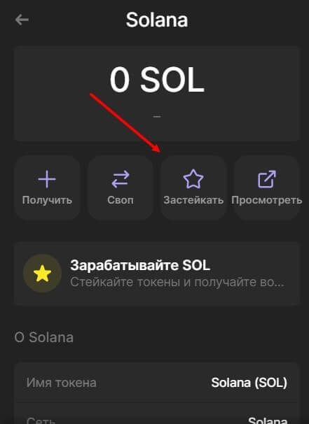 В открывшейся странице криптовалюты Solana (SOL) нужно нажать на кнопку “Застейкать”.