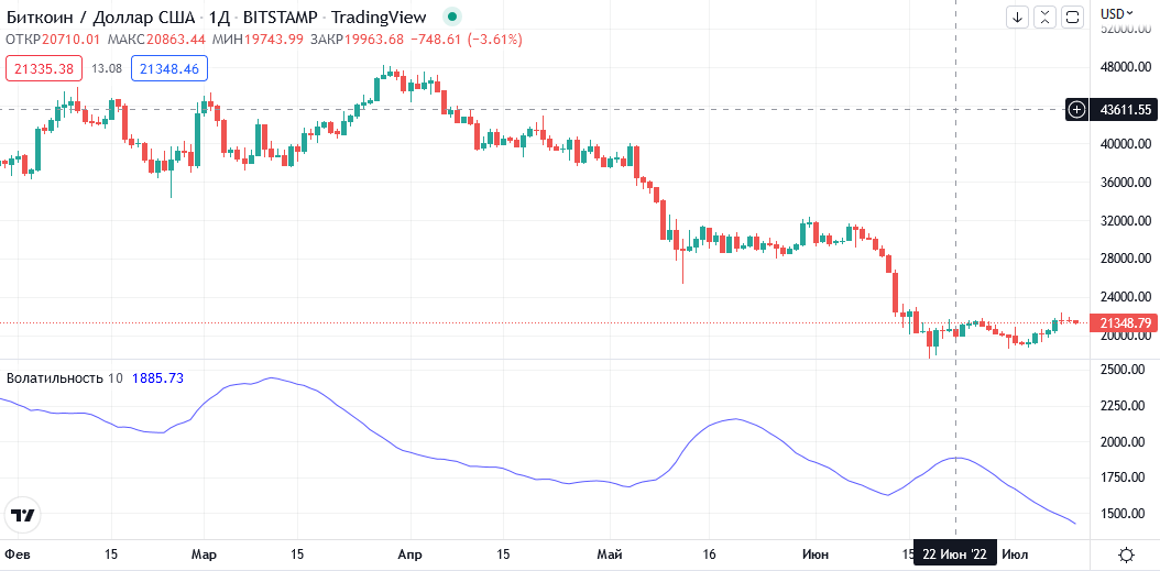 Поняв основные факторы, которые влияют на изменчивость криптоактивов, важно уметь оценивать этот показатель применительно к каждому из используемых инструментов. Ниже представлен дневной онлайн график пары BTC/USD – Биткоина к доллару США. В отдельном окне сформирована линия индикатора-скринера Volatility.