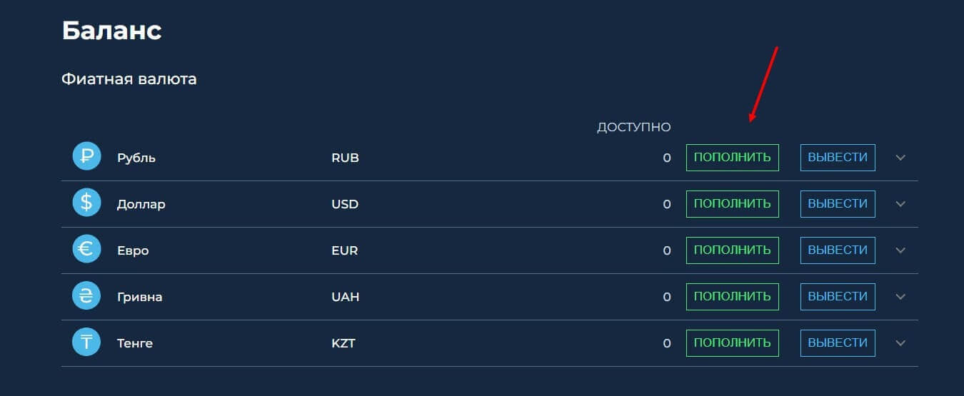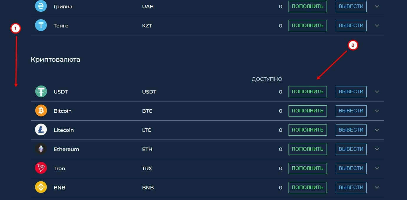 - Перейдите в раздел «Кошелек» и платформа предложит различные криптовалюты для пополнения, такие как Bitcoin, Ethereum и другие в нижней части страницы. Выберите интересующую вас криптовалюту, которую хотите пополнить на баланс, нажав на зеленую кнопку «Пополнить».