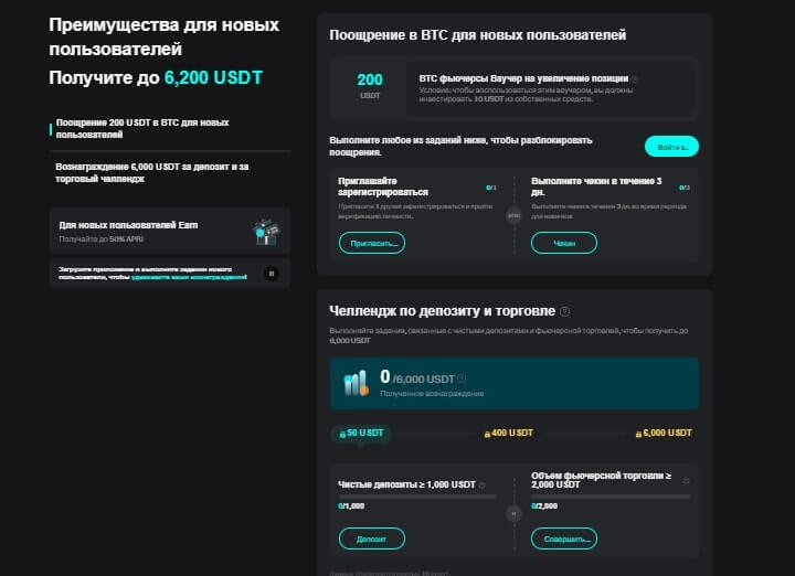 - Челлендж по торговле и депозиту. Можно получить до 6 тысяч USDT пополнив счет на 50 тысяч USDT и совершив торговый фьючерсный объем на 10 миллионов USDT. Также можно получить промежуточные награды: