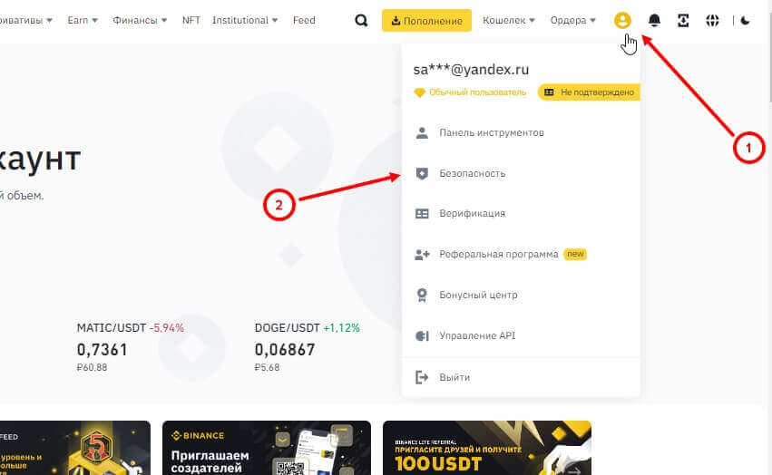 Важным моментом считается обеспечение собственного аккаунта безопасностью. С помощью встроенных мер защиты Бинанса, каждый пользователь сможет защитить средства и персональную информацию от хакерских атак и брутфорса. Чтобы произвести настройку безопасности аккаунта, необходимо навести мышку на иконку человека и выбрать пункт “Безопасность”.