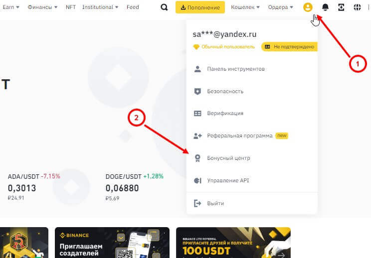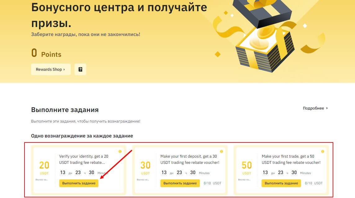 на сайте биржи криптовалют Binance, каждый новый пользователь может получить бонус за регистрацию или верификацию, которые предоставляются новичкам, прошедшим регистрацию. В качестве бонуса клиент сможет получить ваучер на ребейт торговых комиссий. Чтобы посмотреть на список доступных заданий, откройте раздел “Бонусный центр”.