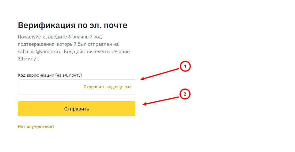 Если код не пришел, то нажмите на кнопку “Отправить код еще раз”. Если же пользователь не получил код после второй попытки, то кликните на ссылку “Не получили код?”, где будет подсказка, как его получить.