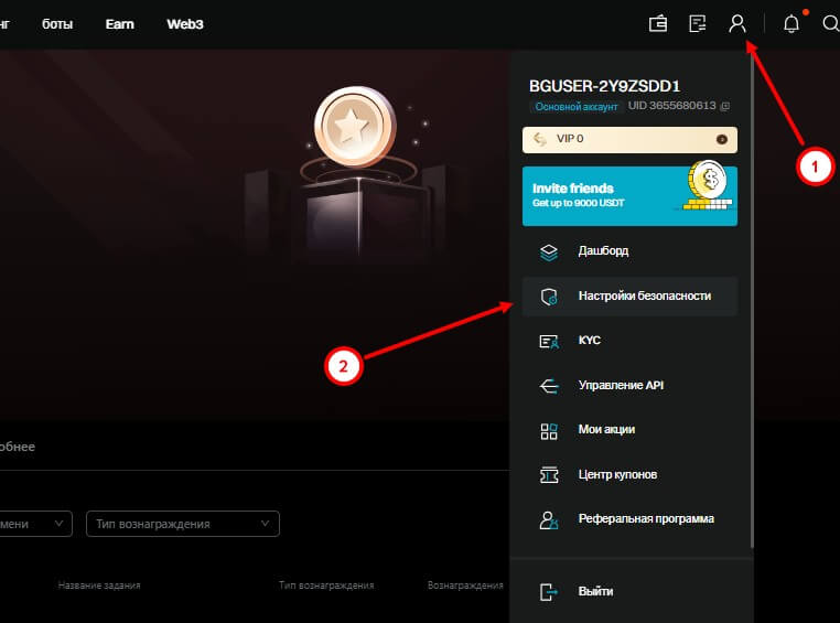 После регистрации и верификации из России необходимо подумать о безопасности личного кабинета. Чтобы сделать это, нужно перейти в раздел “Безопасность”. Для этого нужно выделить мышкой на иконку силуэта человека и нажать на кнопку “Настройка безопасности”.