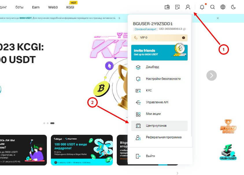 После регистрации компания дарит своим пользователям купоны, являющиеся скидкой на торговые комиссии на спотовую или фьючерсную торговлю. Срок их действия — от 1 месяца. Чтобы перейти в раздел с купонами, необходимо перейти навести мышкой на силуэт человека и нажать на раздел “Центр купонов”.