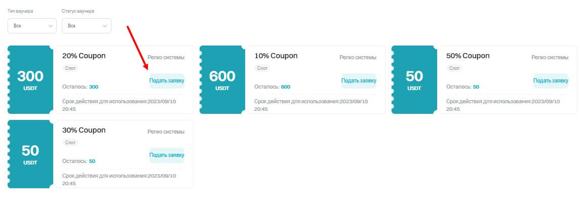 В открывшейся странице каждый сможет увидеть список доступных ваучеров – указана сумма действительности (от 50 до 600 USDT) и процент скидки на комиссии за проведение сделки (от 10 до 50%). Также ниже условий и количества оставшихся купонов можно увидеть их срок действия. Чтобы активировать их, нужно нажать на кнопку “Подать заявку”.