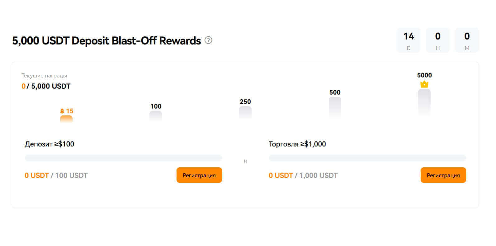 Также можно получить дополнительные 5 тысяч USDT выполнив нужный объем сделок и суммы пополнения за 2 недели: