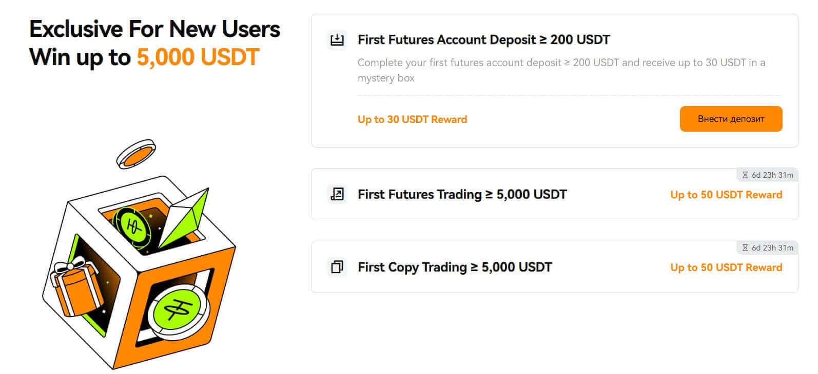 - Первая торговля на фьючерсном рынке на сумму в более 5 тысяч USDT, за выполнения которого можно получить также таинственный ящик с сумму в 50 USDT.