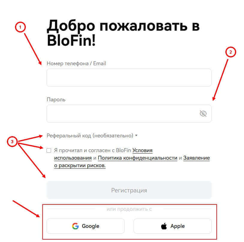 Для начала работы с биржей BloFin первым делом перейдите на официальный сайт платформы, который полностью доступен на русском языке. На главной странице вы увидите кнопку “регистрация”, которую необходимо нажать для начала процедуры создания аккаунта. Затем нужно выполнить следующее: