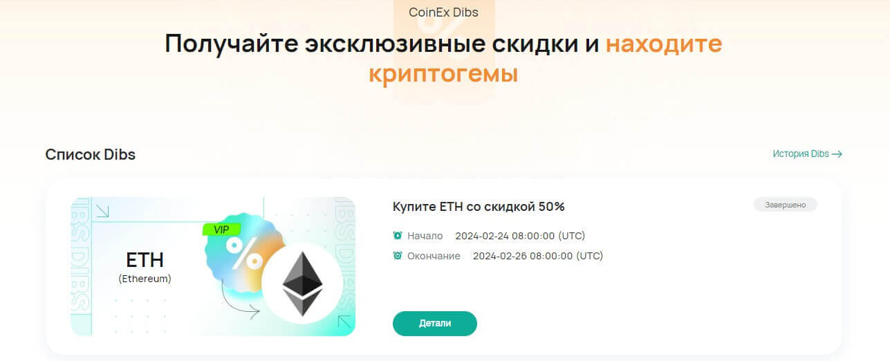- CoinEx Dibs. Каждый активный пользователь сможет получить специальные скидки на покупку криптовалют до 50%. Чтобы воспользоваться предложениями, откройте раздел “Акции” – “CoinEx Dibs” и покупайте криптовалюту с выгодой.