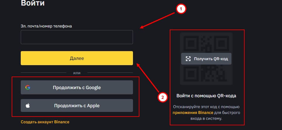 После нажатия на кнопку “Войти с помощью Binance.com”, откроется страница с сайтом криптовалютной биржи, постепенно отходящая от российского рынка, где нужно ввести номер телефона или адрес электронной почты. Также можно продолжить с помощью Google или Apple ID, отсканировав QR-код в приложении Бинанс.