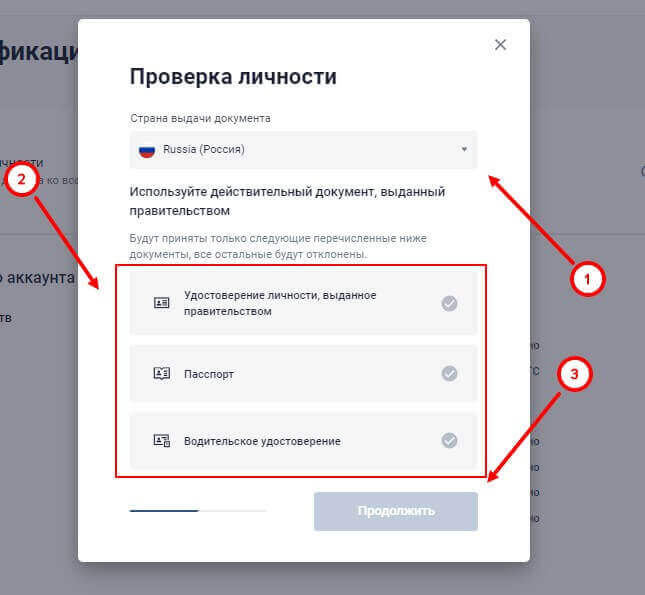 Нажав на кнопку «Продолжить», пользователь откроет окно, где будет предложено указать страну, где был выдан документ, а также выбрать один из вариантов подтверждения личности: паспорт, удостоверение личности, выданное правительством, или водительское удостоверение. Перед тем, как нажать на кнопку «Продолжить», обязательно проверьте правильность выбранных данных. Убедитесь, что выбранный вариант подтверждения личности соответствует вашему документу и включает в себя все необходимые данные.