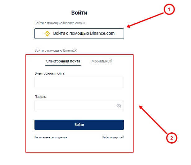 Чтобы войти в личный кабинет, необходимо нажать на кнопку “Войти” в верхней части страницы. Откроется новая страница, где можно авторизоваться двумя способами – войти с помощью аккаунта Binance.com или же воспользоваться данными, используемые при регистрации.