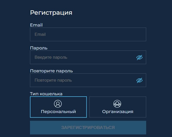 Затем введите свои личные данные, включая такую информацию, как адрес электронной почты, создайте надежный пароль для входа, сочетающий буквы, цифры и специальные символы, а также тип кошелька (персональный или организация). После заполнения необходимой информации нажмите на кнопку “Зарегистрироваться”.