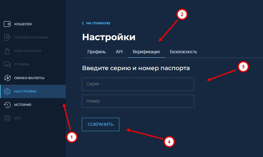 - Верификация. Пройдите процесс верификации, перейдя в личный кабинет, если это требуется для использования всех функций кошелька: как пополнить с карты, так вывести средства или пополнить счет биржи. Подготовьте необходимые документы заранее.