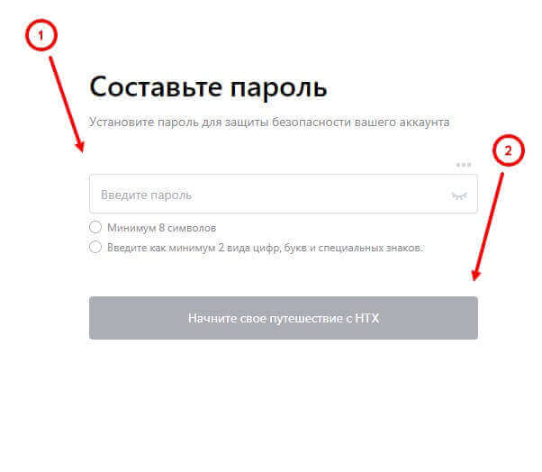 Затем укажите пароль (должен состоять минимум из 8 символов, а также как минимум 2 вида знаков – цифры, буквы и специальные символы). После нажмите на кнопку “начните своё путешествие с HTX”.