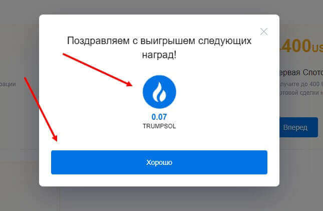 После этого появится окно с призом – в нашем случае это 0,07 TRUMP, что по курсу на момент получения равно 2,7535 USDT. Для продолжения нажмите на кнопку “Хорошо”.